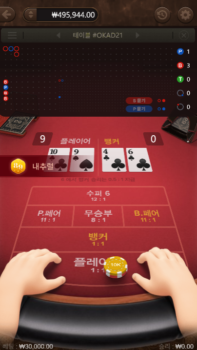 플레이어 9, 뱅커 0. 카드 펼쳐지자마자 그대로 승리. 오랜만에 느껴보는 짧고 강한 긴장감이었다.